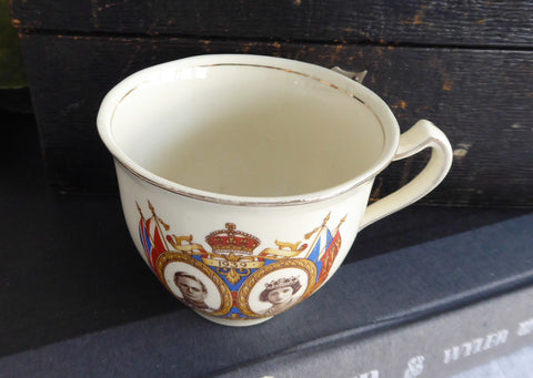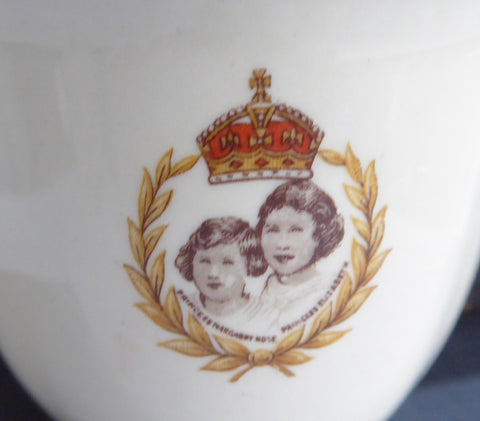 The cup measures 2.75 inches high by 3.25 inches in diameter and has sepia drawings of the king and queen with flags and symbols on the front, the Princess Elizabeth and Princess Margaret on the back and gold trim.