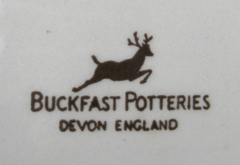 The porcelain plate with gold trim measures 6.25 inches square with notched corners and was made by Buckfast Potteries, Devon England which is still in existence close by the famous Buckfast Abbey.
