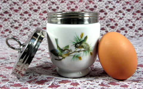 This is a Royal Worcester, England porcelain and chrome egg coddler in a double, 2 egg or king size in the Birds pattern.