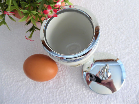 The egg coddler was made in the 1930s and measures 3.5 inches high to top of ring on the lid by 2.75 in diameter.