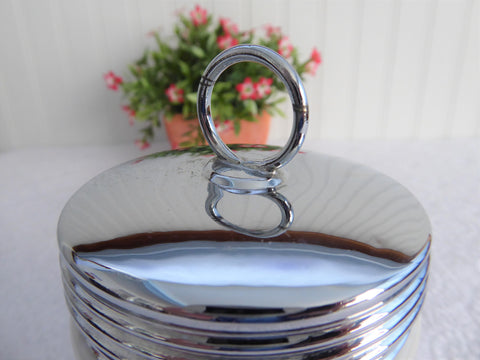 The coddler features a pretty design on white of purple grapes with grapevine and leaves with a tight chrome screw lid.