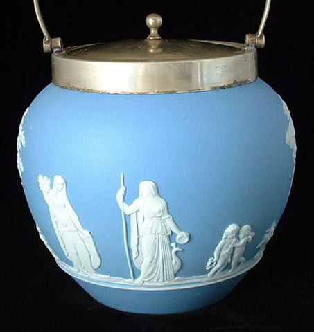 The biscuit jar is of rare light blue jasperware dip in the Offering To Peace design with silverplated EPNS fittings, lid and handle.