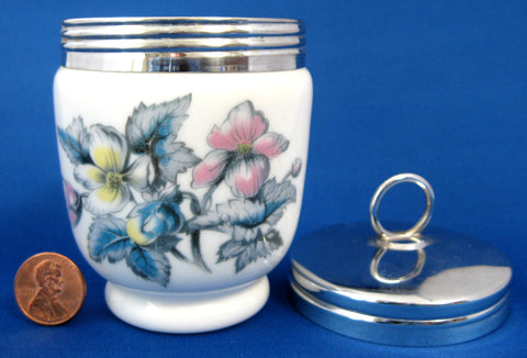 The egg coddler or vintage egg cooker measures 4.5 inches high to the top of the ring by 2.5 in diameter and features a pretty floral bouquet featuring a design of primroses or other wild flowers with a yellow flower on the reverse.