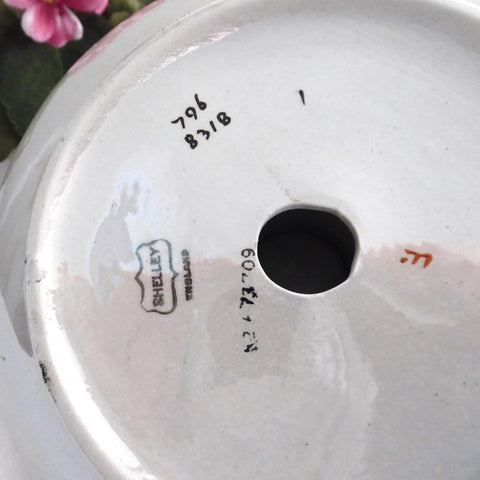 The design is a fabulous unamed pattern which is often called Bird And Grapes, with hand colored enamel over transfer a high luster finish Shelley called Spano Lustra, a famous finish and style developed by Frederick Rhead when he was art director of Wileman Shelley.
