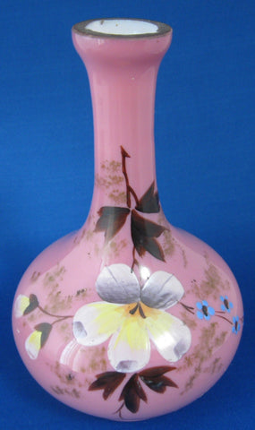 The Vase is 7 inches high by 4.5 in diameter and has a hand painted floral design and a ground pontil on a pink ground with white inner layer.