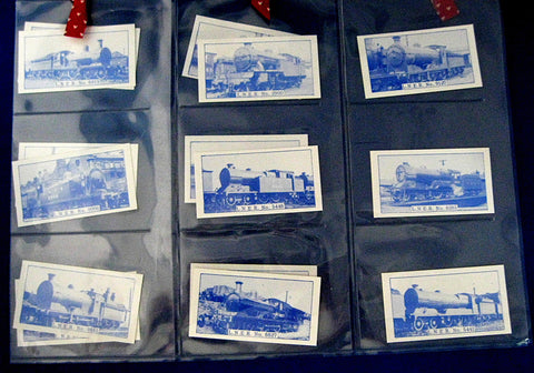 Each blue and white card identifies and is of an engine and is taken from a real photograph and are all marked L.N.E.R. Each card measures each 1.5 inches by 2.75 inches and is in excellent used vintage condition.