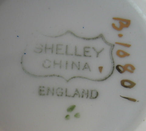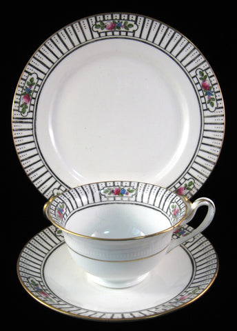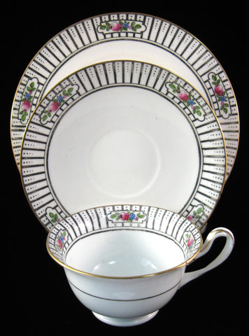 This is an unusual Shelley China, England cup and saucer with matching plate or teacup trio in the an unamed pattern number 10801 with roses, beads and lines or stripes in the rarely seen Milton shape made 1915-1925.