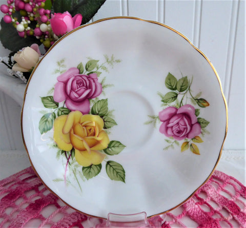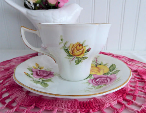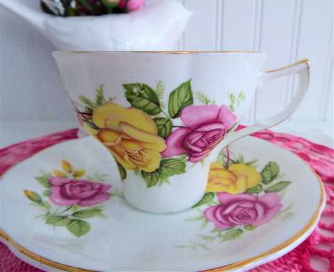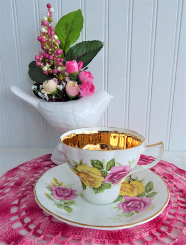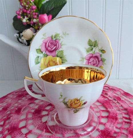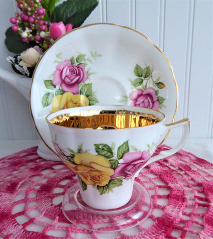 Luxe Gold Band Pink And Yellow Roses Cup And Saucer 1960s Jason England