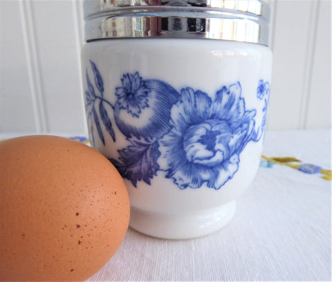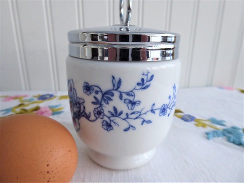 This is a Royal Worcester, England porcelain egg coddler in the large or king size in the Rhapsody pattern with a chrome screw lid.