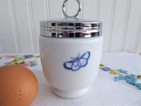 The egg coddler measures 4.5 inches high to the top of the ring, 3.25 to top of coddler by 2.75 in diameter and features a lovely blue and white floral pattern with a blue butterfly on the back.