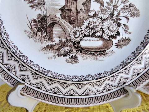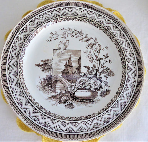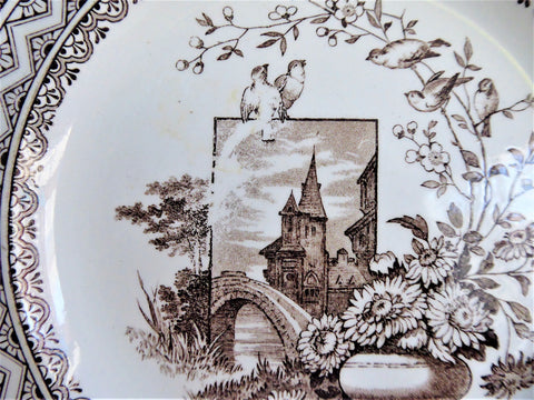 The brown and white plate measures 8.25 inches in diameter and features a banded geometric border with daisies with an urn with flowers, five birds in flowering branches, and a vignette of a manor or castle by a bridge on a lake.