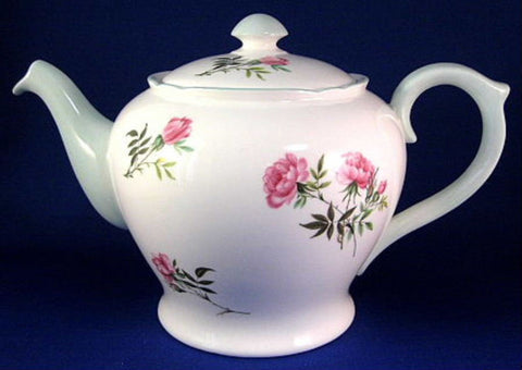 The pretty teapot features a design of a pink blossoms with pale green trim.