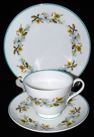 Shelley Bailey's Dogwood Cup And Saucer With Plate Windsor Teacup Trio Teal Trim