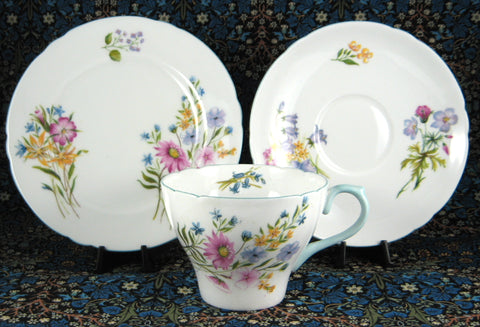 This is a fabulous Shelley, England teacup trio by consisting of a cup and saucer and plate in the late Wildflowers pattern in the New Cambridge shape with pale blue trim.