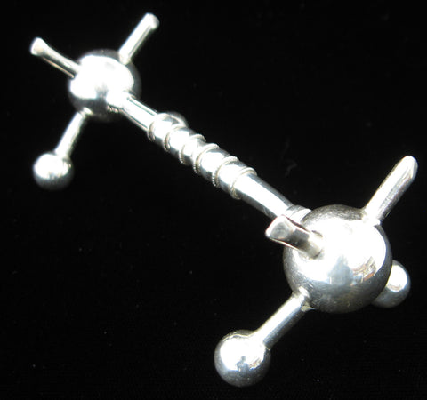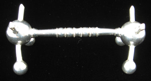 This is an antique Edwardian English silver plated knife rest with ball ends rather like a satellite and a center bar like a turned banister.