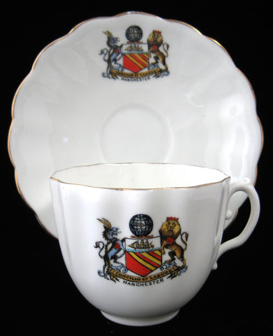This is an antique crested china cup and saucer for Manchester, England made 1917-1930 by Savoy China, England a division of Birks and Rawlins and Company, soon to be a part of Carlton Ware.