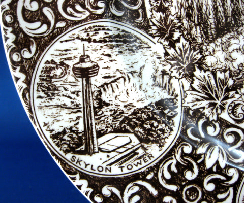 The ironstone plate measures 10 inches in diameter and has vignettes of the falls, Maid Of The mist excursion boat, Hydro Floral Clock, Oneida Observation Tower, The Royal Centre, Skylon Tower and the Spanish Aero Car.