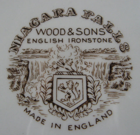 This is an ironstone souvenir brown transferware plate made for Niagara Falls, Canada by Wood and Sons, England in the 1940-1950s.