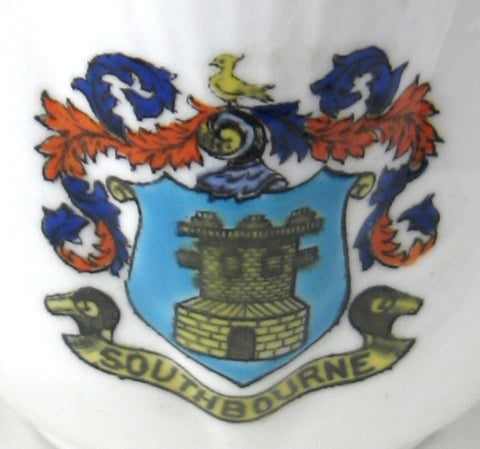 The bone china cup is 2.5 inches high and the saucer is 5.5 in diameter and features the Southbourne coat of arms with gold trim. The crest is extremely well done.