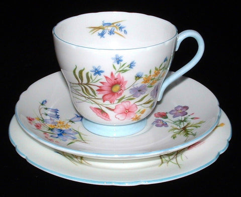 This is a fabulous teacup trio by Shelley, England consisting of a bone china cup, saucer and plate in the late Wild Flowers pattern number 13668 in the Richmond shape with pale blue trim.