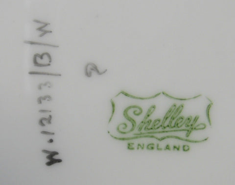 This is a Shelley China, England salad plate measuring 7 inches in diameter in the art deco Eve shape and Blue And Silver Bands pattern number 12133 made 1933-1940.