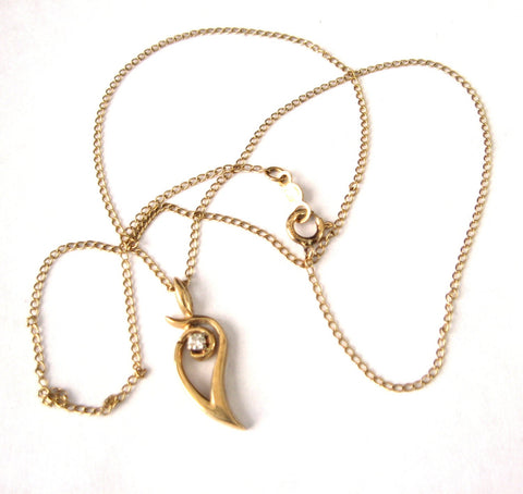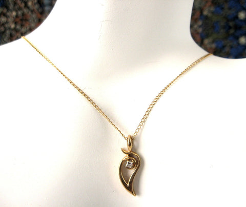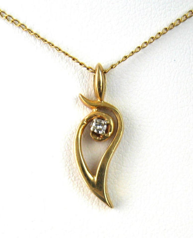 The estate pendant is an open stylized teardrop or leaf shape and is hand prong set with a 5 point or 0.05 carat full cut genuine brilliant Diamond.