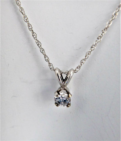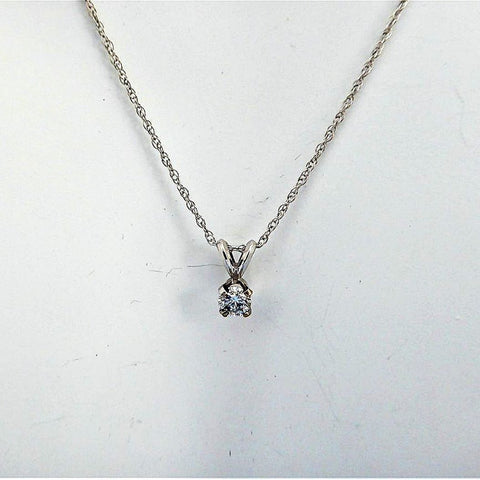 The natural white estate Diamond is hand set in a 4 prong 14k white gold mount and hanging from a 14k white gold 18 inch long rope chain.