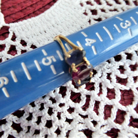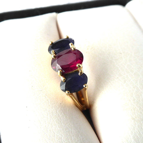 This is a lovely 14k gold 3 gem stone ring from the 1970s with a center red genuine oval Ruby flanked by 2 dark blue genuine oval Sapphires.