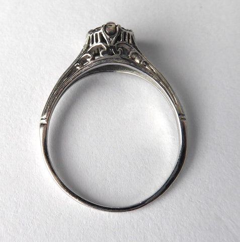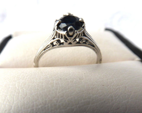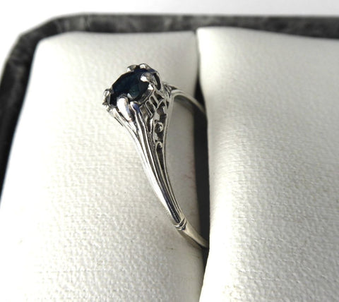 Art Deco Filigree Blue Sapphire Engagement Ring 18K White Gold Estate Hand Pierced
