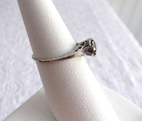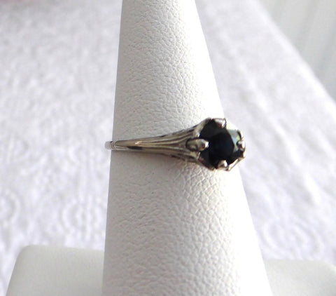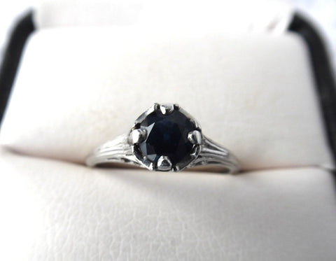 The ring features a 5 mm, 1/2 carat genuine round dark blue, usually referred to as London Blue, Sapphire.