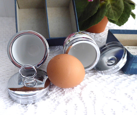 The egg coddler pair are in excellent used vintage condition in their box with info, although the box has a bit of a water stain on the inside of the lid.