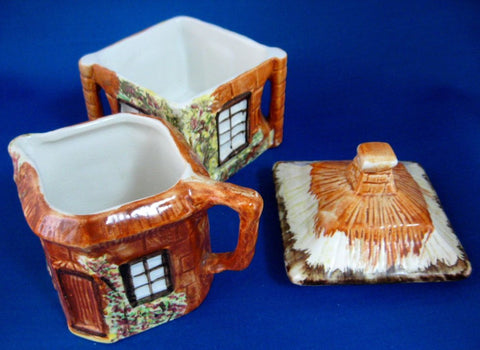 This is a vintage set of Price Kensington, England cream, creamer or milk jug and sugar bowl with lid in cottageware or cottage ware from the 1940-1950s.