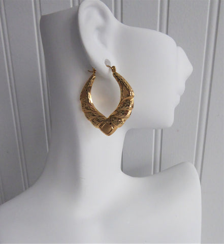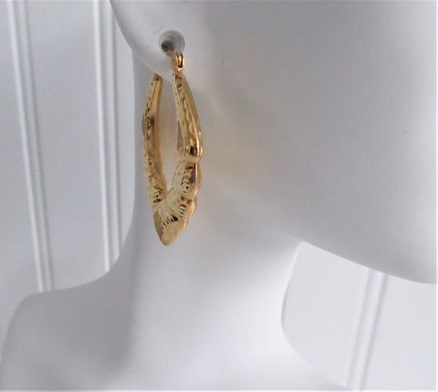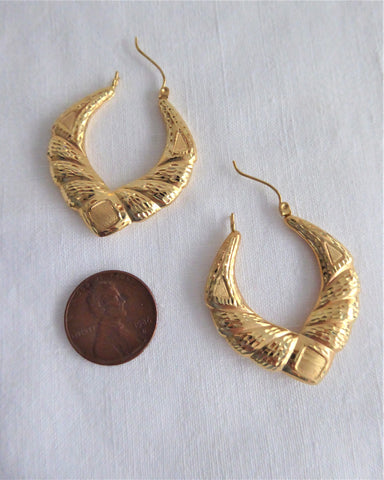 Earrings 14kt Gold Door Knocker Carved 1970s Fancy Hoops Diamond Cut Puffy