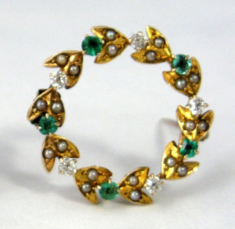 Edwardian Brooch Pin 9kt Gold Wreath Diamonds Emeralds Pearls Hand Made 1900