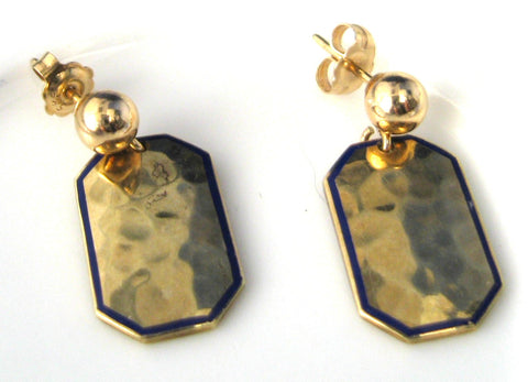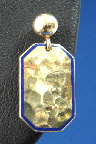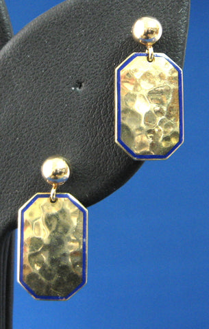 Each earring is a dog eared rectangle measuring 1 inch long including the ball fitting by a little less than 1/2 of an inch wide with a hammered design bordered by navy blue enamel.