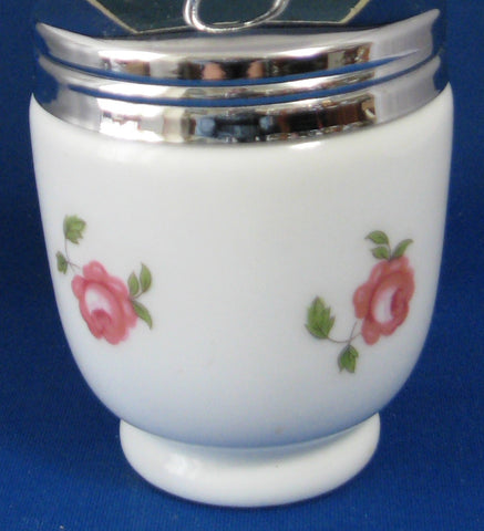 This is a 2 egg porcelain egg coddler by Royal Worcester, England in a double or king size in the Bournemouth pattern with a chrome screw lid.
