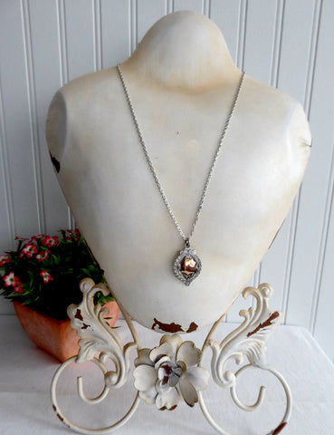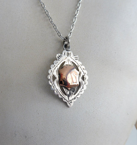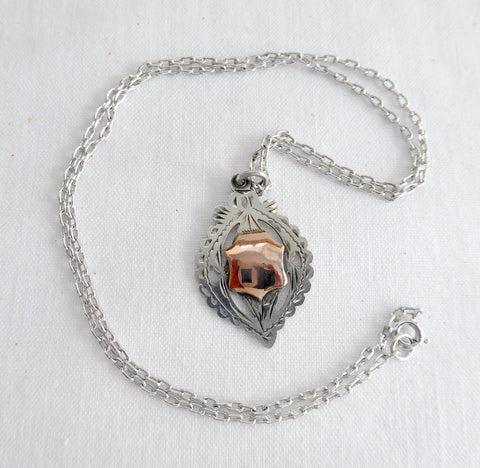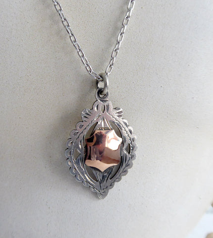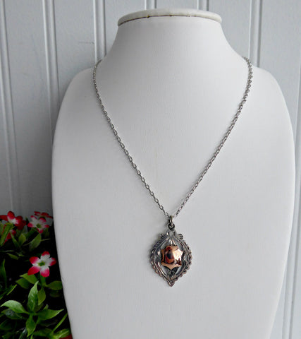 This is a sterling silver English pocket watch fob necklace with a hallmarked English hand pierced sterling silver pocket watch fob with a 10ct or 10kt rose gold shield on a sterling silver rope chain dating to 1915.