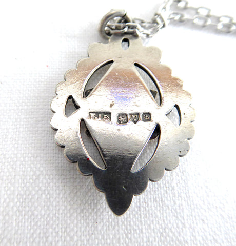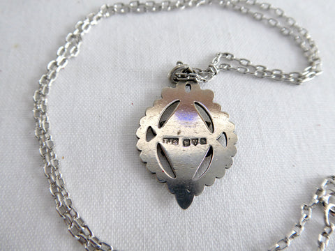 size: 1.25 inches high by .8 inch wide; 18 inch sterling chain