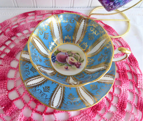 This is a beautiful Paragon China, England fancy cabinet cup and saucer in a pattern of fruit centers with French blue on white bone china and a fancy gold overlay pattern with burnished gold trim.