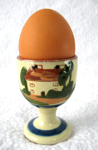 This is a mottoware or motto ware pedestal single egg cup, made by Aller Vale, Torquay in Devon, England 1920s and featuring the traditional cottage and the motto A Rolling Stone Gathers No Moss.