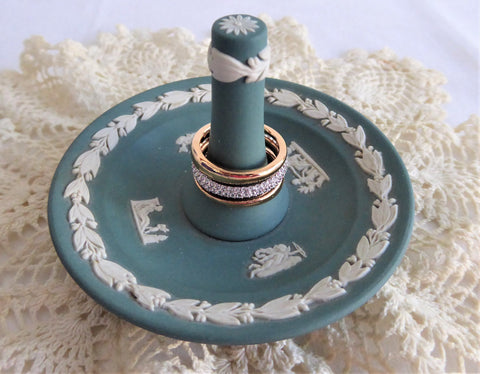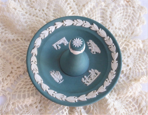 This is a wonderful 1980s Wedgwood, England jasperware ring holder in a teal or nile green with the applied white jasperware motifs of cupids and the Proposal from the 1980s.