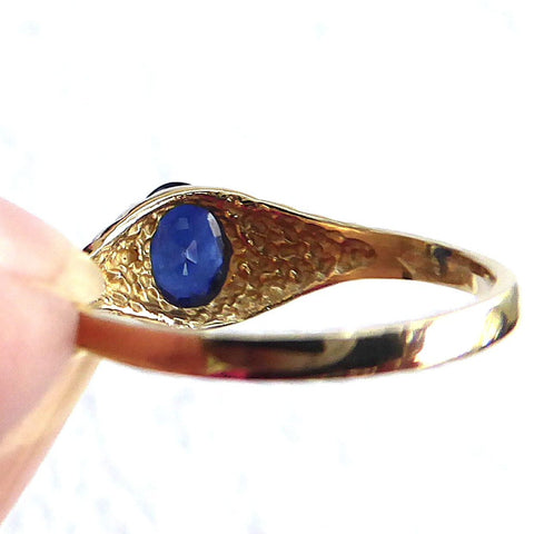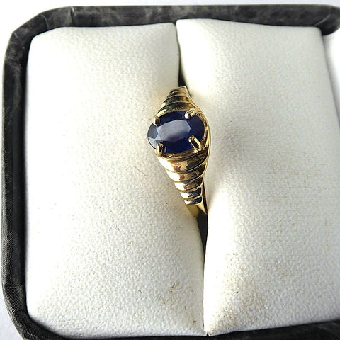 This is a vintage 1970s ladies 14k gold oval 3/4 carat genuine blue Sapphire with stepped shoulders from the 1970s.