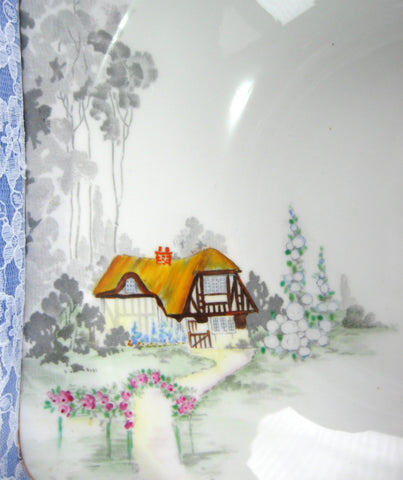 This is a Shelley, England art deco large serving bowl in the Queen Anne shape and Cottage-2, Cottage 2 or Thatched Cottage design 11621 with hand colored on transfer cottage, hollyhocks and trees with enamel accents and gold orange color trim.
