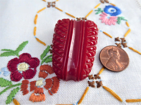 Vintage 1930s Dress Clip Cherry Red Bakelite Art Deco Carved Neckline Clip