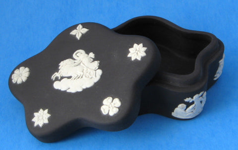 This is a star shaped Wedgwood, England black jasper or jasperware lidded box with applied white jasper classical figures of Aurora And The Chariot Of Dawn and cherubs or cupids on the sides in several activities made in 1972.