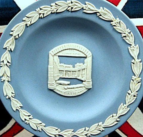 The small plate measures 4.5 inches in diameter and features a white applied jasperware of the famous Roman baths in Bath, England with an acanthus leaf border.